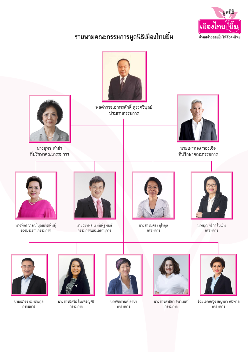 “มูลนิธิเมืองไทยยิ้ม” เรียกเป็นภาษาอังกฤษว่า “Muang Thai Yim Foundation”มูลนิธิเมืองไทยยิ้ม จัดตั้งขึ้นด้วยเจตนารมณ์ในการช่วยเหลือและแบ่งเบา
